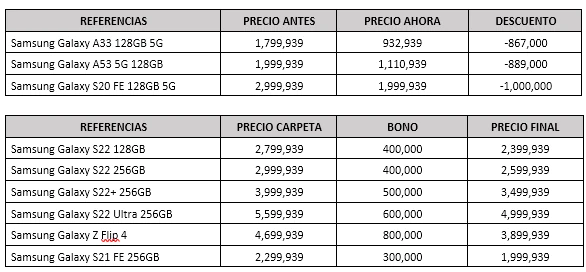 Oferta de celulares valida desde el 28 de marzo hasta 5 de abril de 2022 Samsung Galaxy S22 128GB / 256GB y Samsung Galaxy SS22+ 256GB con accesorio Galaxy Buds 2 y Galaxy Smart Tag Plus de obsequio, válida para clientes individuales desde el 28 de marzo hasta 5 de abril de 2022 o hasta agotar existencias, son 20 unidades disponibles en preventa de esta referencia seleccionada de marca Samsung.