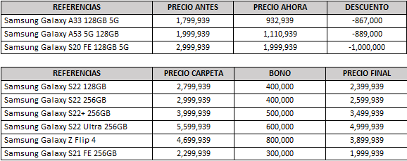 Oferta de celulares valida desde el 20 de abril del 2022 hasta 30 de Junio de 2022 en referencias Samsung Galaxy S22 128GB / 256GB y Samsung Galaxy SS22+ 256GB con accesorio Galaxy Buds 2 y Galaxy Smart Tag Plus de obsequio, Promoción valida por tiempo limitado o hasta agotar existencias, son 20 unidades disponibles en preventa de esta referencia seleccionada de marca Samsung.