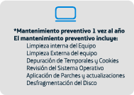 Nuestros equipos cuentan con garantía extendida de 36 meses y, durante la vigencia del contrato (12, 24 o 36 meses), nos encargamos del soporte y mantenimiento que se requiera a través de atención telefónica o en la sede del cliente cuando sea necesario. Además, contamos con equipos de respaldo para la continuidad operativa y mantenimiento preventivo 1 vez al año