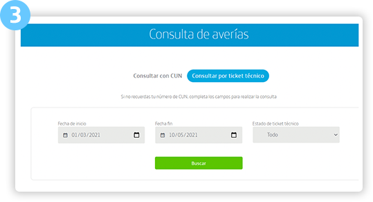 3. Verás la opción para indicar el CUN o fechas y poder consultar fallas reportadas en tu servicio