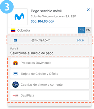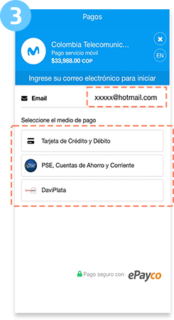 3. Ingresa tu correo electrónico y elige el medio de pago de tu preferencia.
